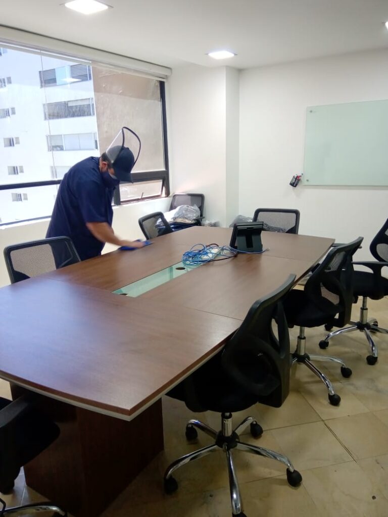 Desinfección, limpieza de oficinas y parqueaderos.